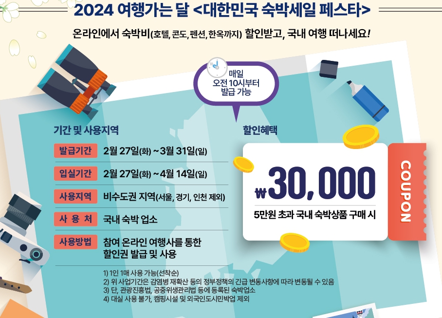 숙박할인권은 2024년 2월 27일 화요일부터 제공되며, 매일 오전 10시부터 발급이 시작됩니다. 이 할인권은 총 46개의 온라인 여행사와 40개의 온라인 채널을 통해 제공되며, 1인당 1매만 신청할 수 있습니다. 할인권은 선착순으로 발급되며, 수량이 소진되면 더 이상 발급되지 않으므로, 관심 있는 분들은 서둘러 신청하는 것이 좋습니다. 이번 할인권은 5만 원을 초과하는 숙박상품 예약 시 3만 원의 할인 혜택을 제공하며, 특히 비수도권 지역의 숙박시설에 한정되어 있다는 점을 유의해 주세요. 비수도권 지역이란 서울, 경기, 인천을 제외한 지역을 의미하며, 이를 통해 지방 관광과 지역 경제 활성화를 목적으로 하는 행사입니다.